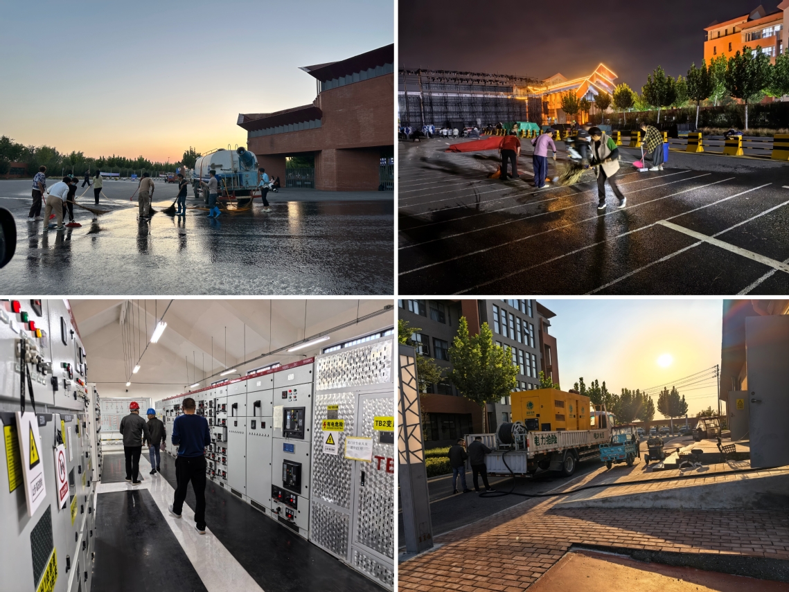 晚会开始前,保洁人员提前就位打扫活动现场环境,配合洒水车仔细冲刷地面;晚会结束后,总务处组织保洁人员连夜对活动现场进行清扫。经过数小时的辛勤劳作,活动场地恢复了整洁面貌,为师生营造了干净、舒适的校园环境。