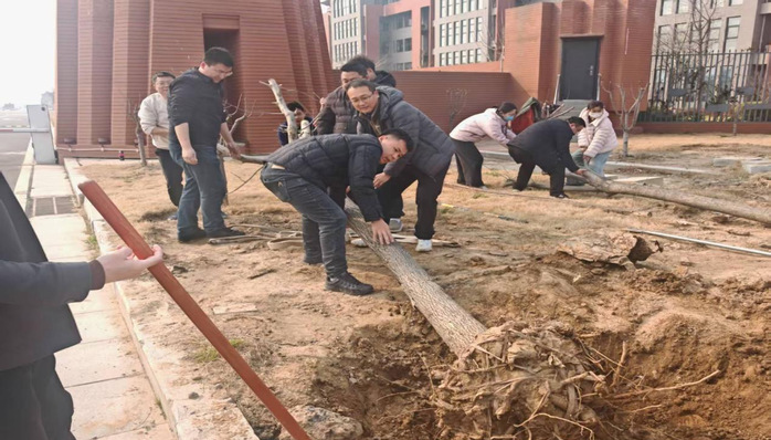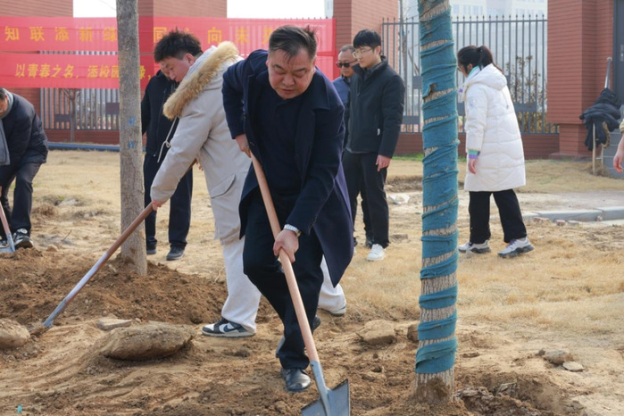 活动现场,大家热情高涨、干劲十足。在总务处工作人员的调度下,参与人员分工协作、配合默契:有的挥锹铲土,有的扶苗填坑,有的踩实浇水,每一道工序都一丝不苟。大家齐心协力将一棵棵树苗稳稳植入土中,浇灌定根水,用双手为校园播撒下绿色的希望。崭新的树苗迎风挺立,与红墙黛瓦的校园建筑相映,勾勒出一幅生机盎然的春日画卷。